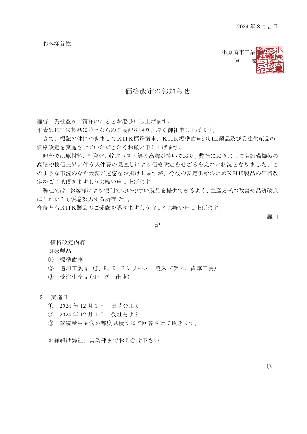 此次,KHK公司將對KHK標(biāo)準(zhǔn)齒輪、KHK標(biāo)準(zhǔn)齒輪追加工及定制產(chǎn)品進(jìn)行價格變更。
