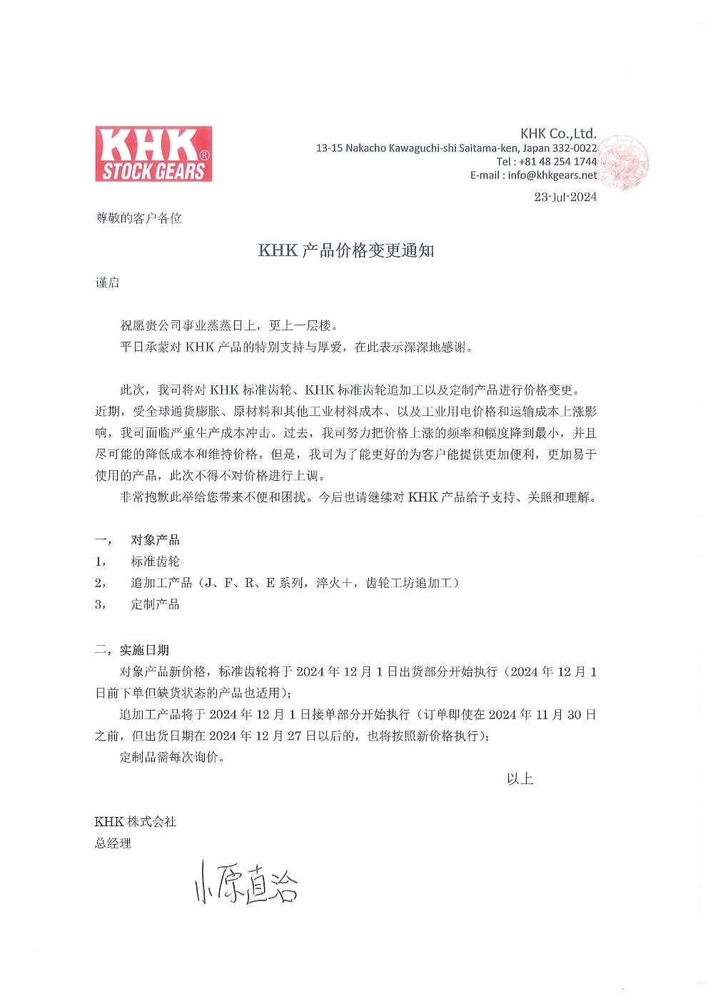 KHK 關(guān)于部分產(chǎn)品價格調(diào)整的通知
