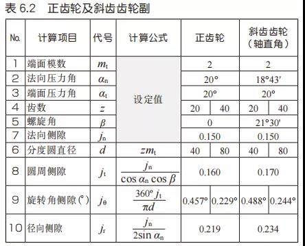 表6.2是正齒輪及斜齒輪齒輪副的側(cè)隙的計(jì)算例。增減中心距離(徑向齒隙),可以調(diào)節(jié)齒輪副的齒隙。